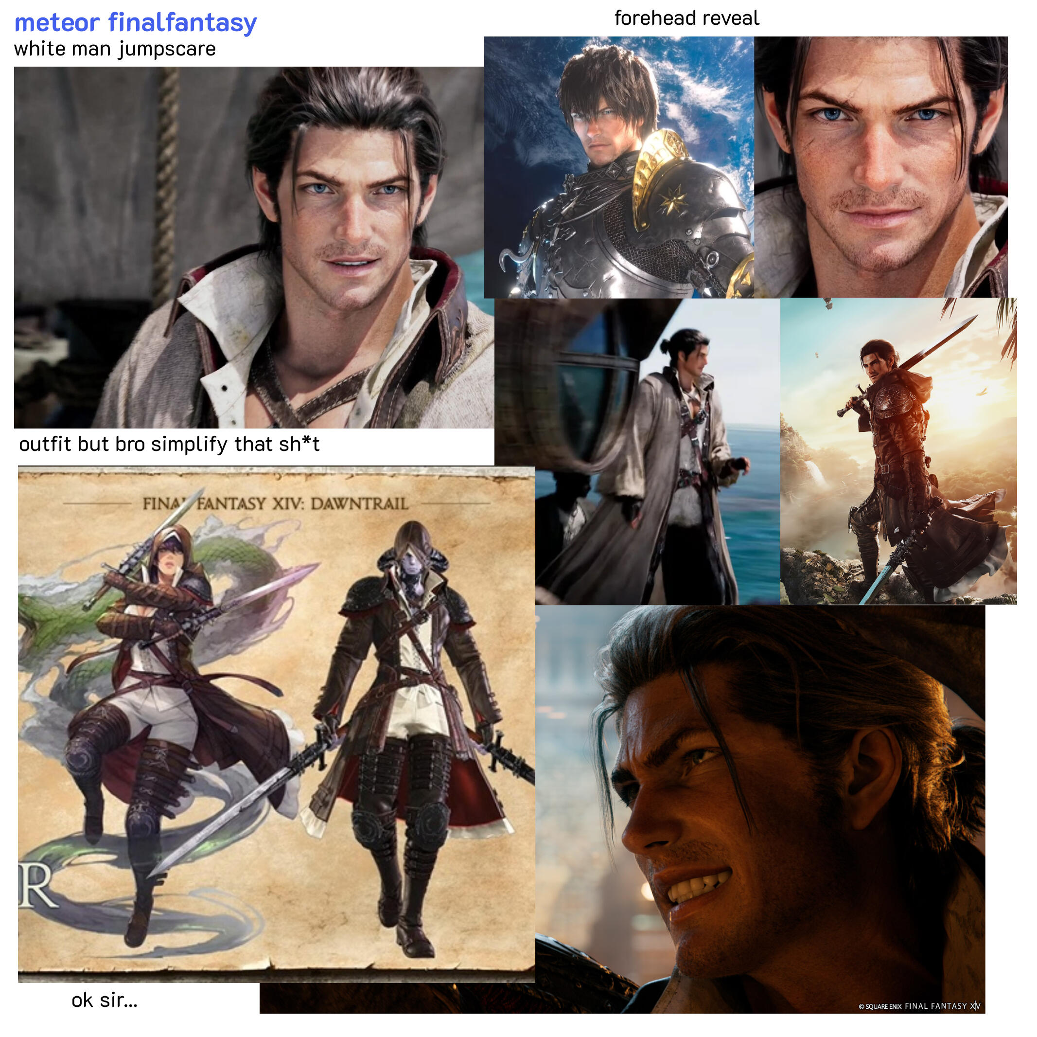 if you're not familiar w/ ffxiv this is the default player character (WoL) they use in cgs but i added him into Ruca's lore as an npc. (he's ruca's shard from the 2nd... hydaelyn yoinked him out of that reflection just before the joining and threw him into the source beginning of edw to "replace" ruca since he was playing house on the first with granson). he's very generic protag ofc charming guy with a sense of humor. very reliable, heroic, etc.ruca hates his guts.. big time... he doesn't know that meteor is his shard so he feels this unexplainable pull towards him? and gets it confused with sexual desire. so they have a lot of sexual tension and they bicker n argue all the time....meteor is more chill and easy going. he likes to rile ruca up for fun. he's like the only guy that isn't terrified of pushing ruca's buttons so he takes advantage of that lol. ruca smacks him with his staff a lot.regardless of their up and down relationship ruca does end up seeing him as one of his closest friends and one of the only people he feels comfortable talking to since they're both WoLs so meteor knows what its like to have all those expectations and to be kind of alienated from everyone around you because you're "hydaelyn's chosen".