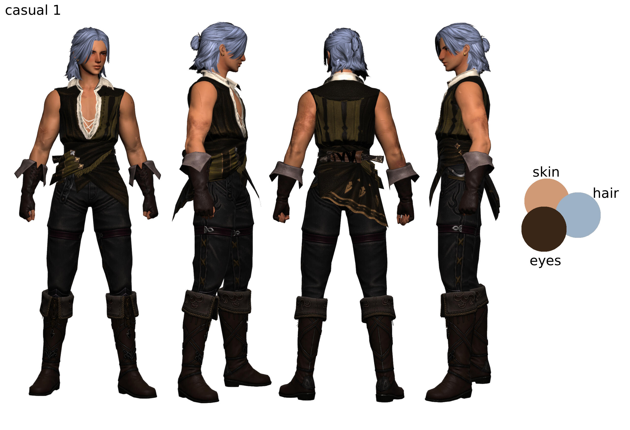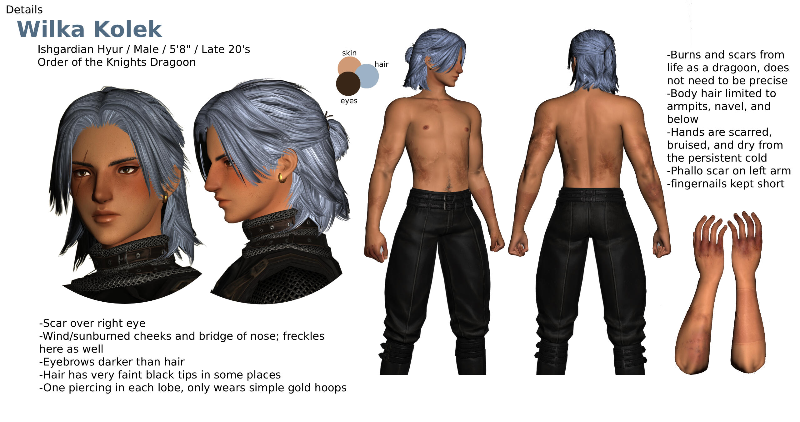 Born to a family of traveling farriers, Wilka moved around Coerthas from farm to farm. He grew up accustomed to being around animals moreso than humans but becoming a dragoon was a dream he always had as a little kid. When the calamity struck, he and his mom had little choice but to seek shelter in Ishgard. After years of rigorous training and some good luck, Wilka could finally take up the title of dragoon but the dragonsong war ended shortly after and he was kind of left in a perpetual state of "what now?"He's usually very serious, very by the book, law-abiding citizen, polite and chivalrous most times, but his anger does tend to get the better of him. He's an underdog and keeps an eye out on those most unfortunate so he tends to get in a lot of fights to protect others. He does have a more playful, childish side but that behavior is typically reserved for those he's really close with.Wilka is a menace in battle though. He loves fighting creatures way bigger than him. He's careless and chaotic and doesn't care for his own wellbeing, ends up hurt A LOT. Has to be dragged home or saved by his dragoon friends.-forgot to add to his ref sheet but he does have sharper upper canines. little fangies. they are just for looks. pic added below for reference. :)I tried to give a couple outfits as options to choose from but as always, please feel free to simplify the clothing! Any questions I can be reached at @ennokos on bsky! or gmail at enwoof[at]gmail[dot]com!